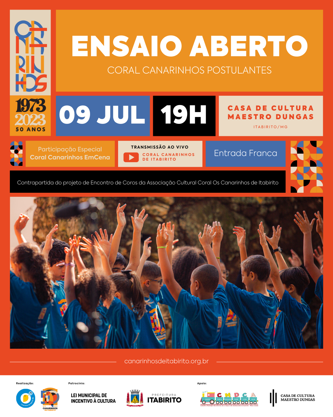 O Ensaio Aberto do Coral Canarinhos Postulantes acontece sempre no final de cada semestre e é o momento onde as crianças e os adolescentes do coro demonstram através de suas atividades pedagógicas, de técnica vocal e canto coral uma parte da sua rotina, sendo canarinhos e canarinhas.